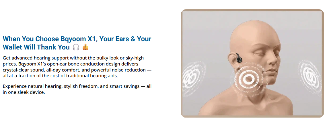 Experience the future of hearing with an open-ear design that keeps you connected to the world — naturally and comfortably. No plugs, no pressure, just crystal-clear sound and effortless conversations. Say goodbye to bulky traditional aids and hello to sleek, smart, and modern hearing support that moves with you — whether you’re chatting, jogging, or relaxing at home. Discover why Bqyoom X1 is changing how people hear — and live.